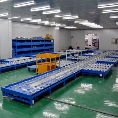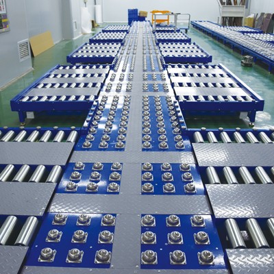 动力式辊筒线 常用于水平的或向上微斜的输送线路。驱动装置将动力传给辊子,使其旋转,通过辊子表面与输送物品表面间的摩擦力输送物品。按驱动方式有单独驱动与成组驱动之分。前者的每个辊子都配有单独的驱动装置,以便于拆卸。后者是若干辊子作为一组,由一个驱动装置驱动,以降低设备造价。成组驱动的传动方式有齿轮传动、链传动和带传动。动力式辊子输送机一般用交流电动机驱动,根据需要亦可用双速电动机和液压马达驱动。又称辊筒输送机,辊道输送机。